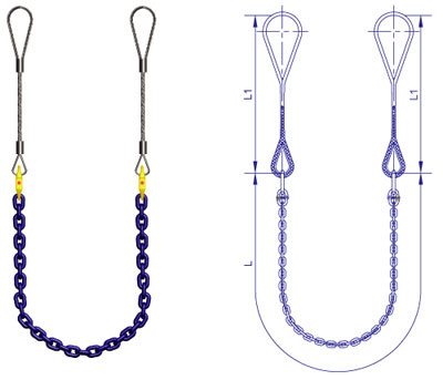 鋼絲繩索具與鏈條索具之間用相應噸位的長吊環連接,鏈條與吊環之間可以用連接環連接也可以用鏈條卸扣連接。